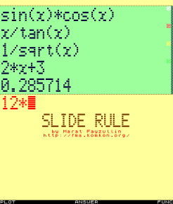 When you open Slide Rule application, it presents you with a screen shown above. The green area at the top displays the most recent computation results. It is similar to a paper roll in a printing calculator. The yellow area at the bottom serves to enter data. Just like in a traditional calculator, you type in arithmetic or algebraic expressions and get the answer by pressing the central button on the directional pad. If your phone is blessed with a QWERTY keyboard, it will work in the expected way. To enter data with the dialpad, use it as follows: